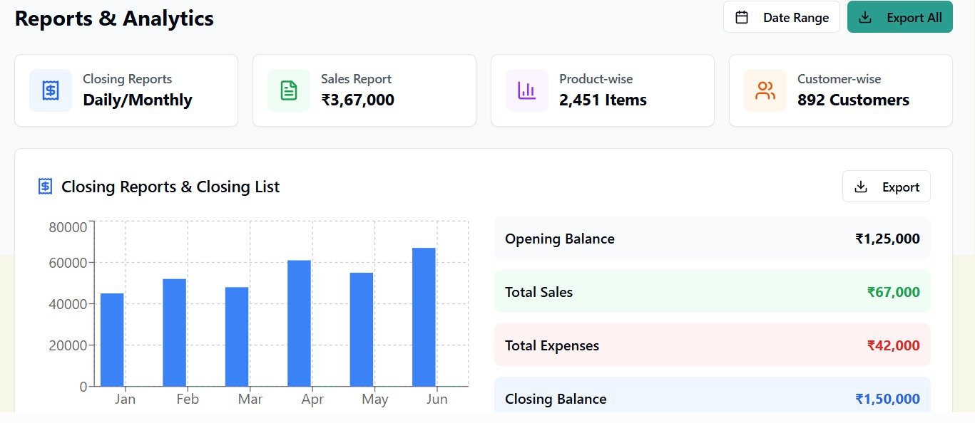 Generate GST-compliant invoices and detailed reports.